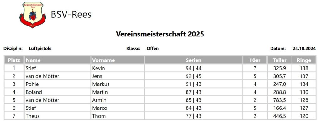Ergebnisse Vereinsmeisterschaft (Archiv):